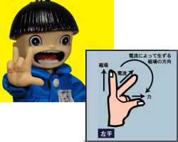 こうではないゾ!こうではないゾ! 人差し指と親指を広げるのはいい。しかしそこで薬指まで 広げてしまうと、それは「グワシ!!」だ。 せっかく爽快なオープンエアクルーズをお楽しみの仲間を えもいえぬ負のパワーで圧倒するのは考えもの。 しかしこのスタイル、筋肉への負担が大きいゆえ そうカンタンにできるものではないけれど。。。 そしてもうひとつ。親指、人差し指、そして中指のパターン。 昔々、理科で習ったフレミングの法則。見覚えあれど 意味は忘却の彼方。こんなので人を悩ませてもいけません。 | |